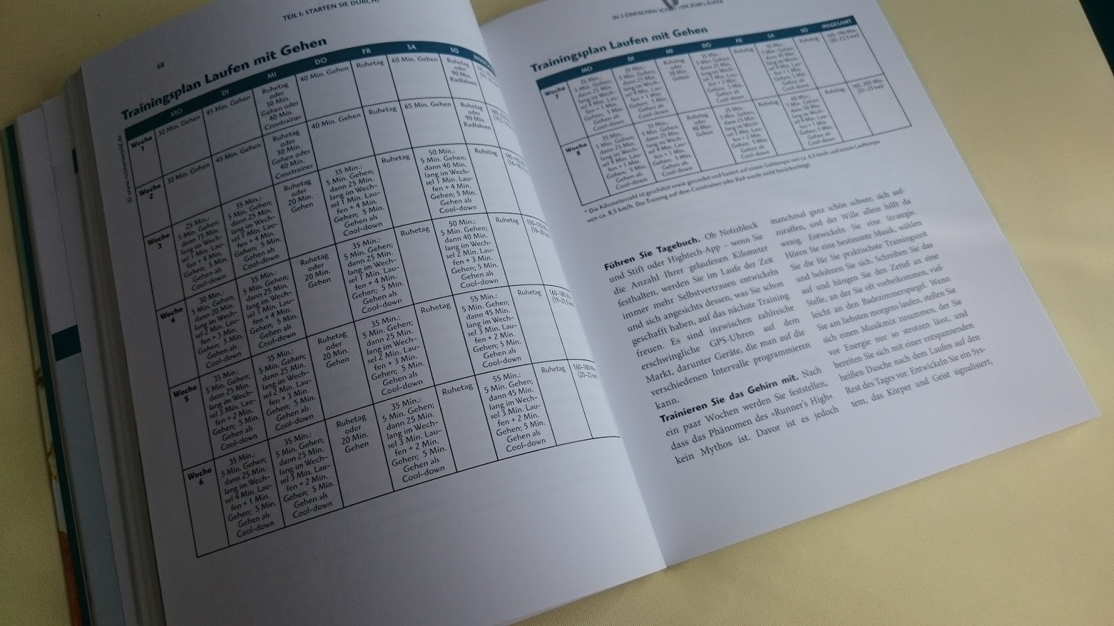Das Buch ist simpel in drei große Abschnitte geteilt. Der Erste befasst sich mit dem Laufen an sich und dem Starten und macht somit den Großteil des Buches aus. Der zweite Part beschäftigt sich mit der richtigen Ernährung und konnte mir einiges darüber beibringen. Demnach habe ich beim dieswöchigen Einkauf besonders die Augen geöffnet. Der dritte und letzte Teil macht vor allem auf Schwierigkeiten beim Laufen aufmerksam und gibt Tipps zur Vermeidung von Verletzungen oder schlimmstenfalls zur Behandlung solcher. Das Buch zeigt fünf verschiedene Trainingspläne auf, die an verschiedenen Stellen ansetzen, so dass es für jeden eine Möglichkeit bietet, mit dem Laufen zu beginnen. Egal ob 140 oder 90 Kilo, ob nach einer Pause oder nach einem komplett sportfreien Jahr. Motivation gibt es durch viele verschiedene Geschichten von Laufanfängern, die über das Buch verteilt sind und nur noch mehr Antrieb geben.